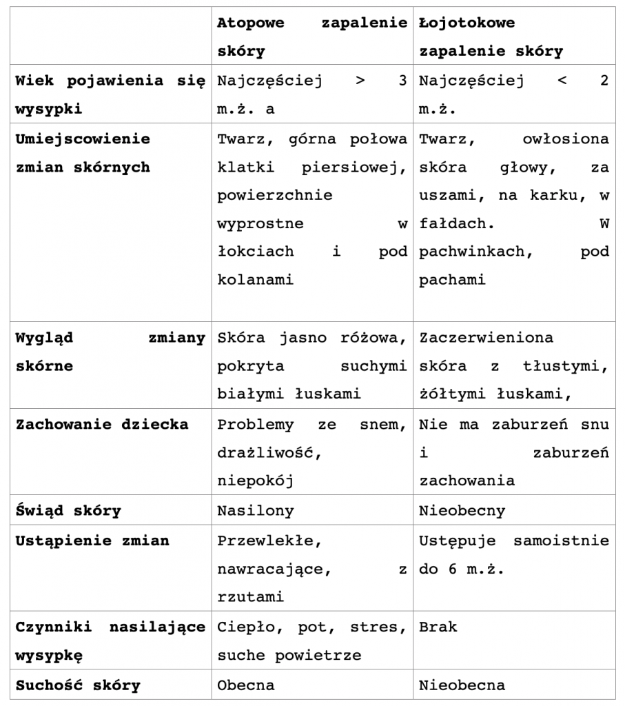 Poniżej w tabeli zamieściłam różnice między łojotokowym zapaleniem skóry i atopowym zapaleniem skóry.