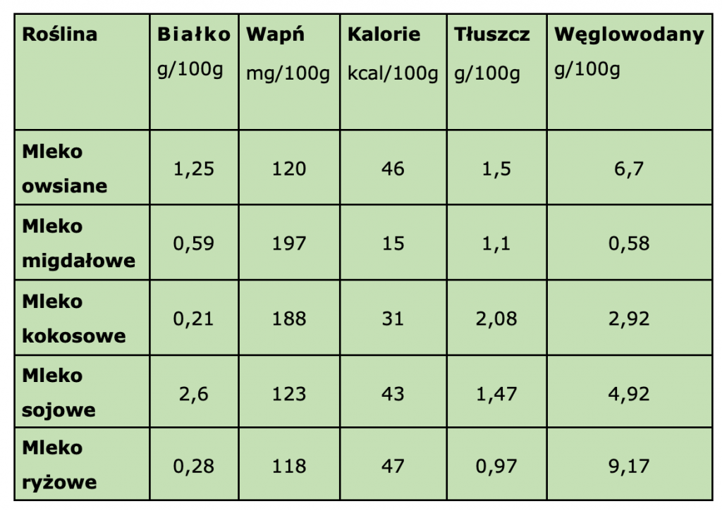 Jak możecie zauważyć najwięcej kalorii zawiera mleka ryżowe i owsiane. Z kolei najwięcej białka zawiera mleka sojowe. Zawartość białka w mleku owsianym jest najbardziej zbliżona do zawartości białka w mleku kobiecym.