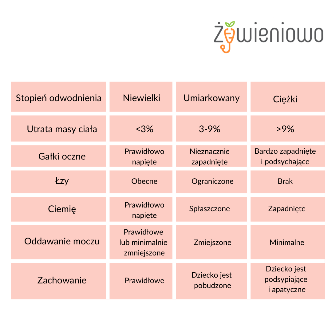 Zgodnie z zaleceniami WHO odwodnienie u dzieci stopniujemy ze względu na procentową utratę wody.
