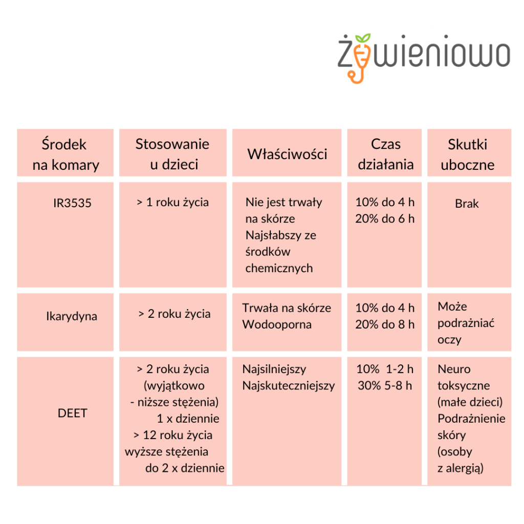Rok w rok komary utrudniają nam beztroski wypoczynek na łonie natury, szczególnie w pobliżu zbiorników wodnych, ale nie tylko. Z kolei półki w sklepach uginają się od środków odstraszających komary, tylko nie wiadomo jakim kryterium kierować się przy ich wyborze. Zawsze warto zacząć od środków naturalnych, a na końcu sięgać po środki chemiczne. Jeśli chodzi o stosowanie środków odstraszających komary u dzieci, to bardzo ważne jest także kryterium wiekowe. Małe dzieci, do ukończenia 1 roku życia, nie powinny być narażane na substancje chemiczne zawarte w środkach odstraszających komary. Z kolei środki naturalne, np. olejki eteryczne mają bardzo małą skuteczność. Jak poradzić sobie w natłoku informacji? Przede wszystkim czytać etykiety produktów odstraszających komary. Podobnie jak w przypadku kremów do opalania sprawdzajcie dokładnie skład.